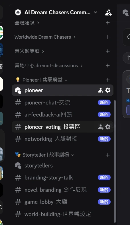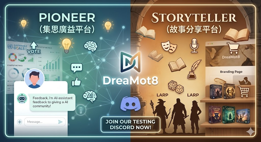 在這個資訊爆炸的時代,我們每天都被無數的「想法」與「內容」淹沒。然而,一個好的點子如果缺乏執行與反饋,終將只是空想;一個動人的故事如果沒有聽眾與舞台,也難以產生共鳴。我們一直在思考:如何建立一個空間,既能讓理性的創新落地,又能讓感性的創意飛翔?於是,Pioneer(集思廣益平台)Storyteller(故事分享平台) 应运而生。今天,我們很高興地宣佈,這兩個平台的 Discord 測試伺服器正式開放!我們誠摯邀請你成為第一批探索者。