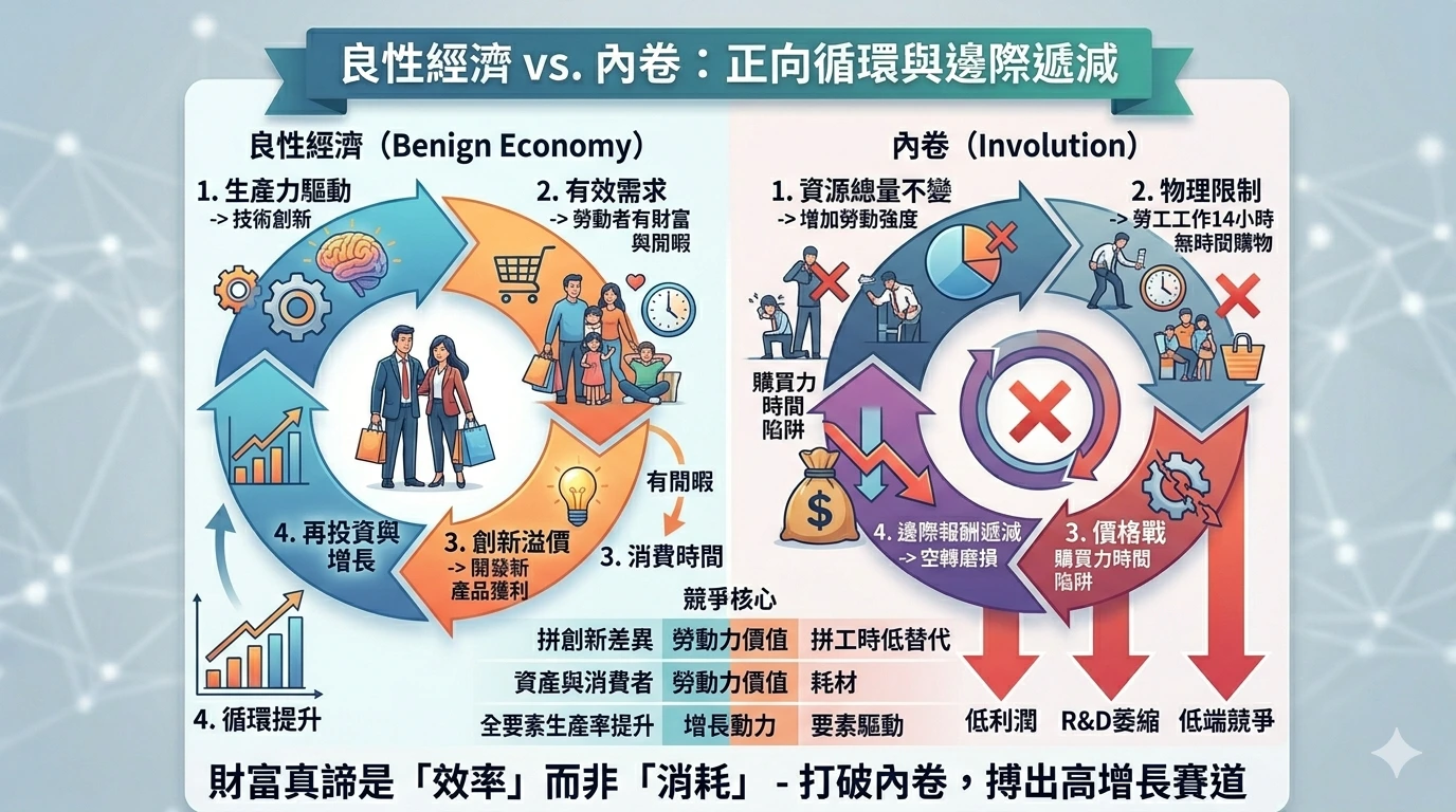 | 維度 | 內卷化經濟 (惡性) | 良性循環經濟 (良性) |